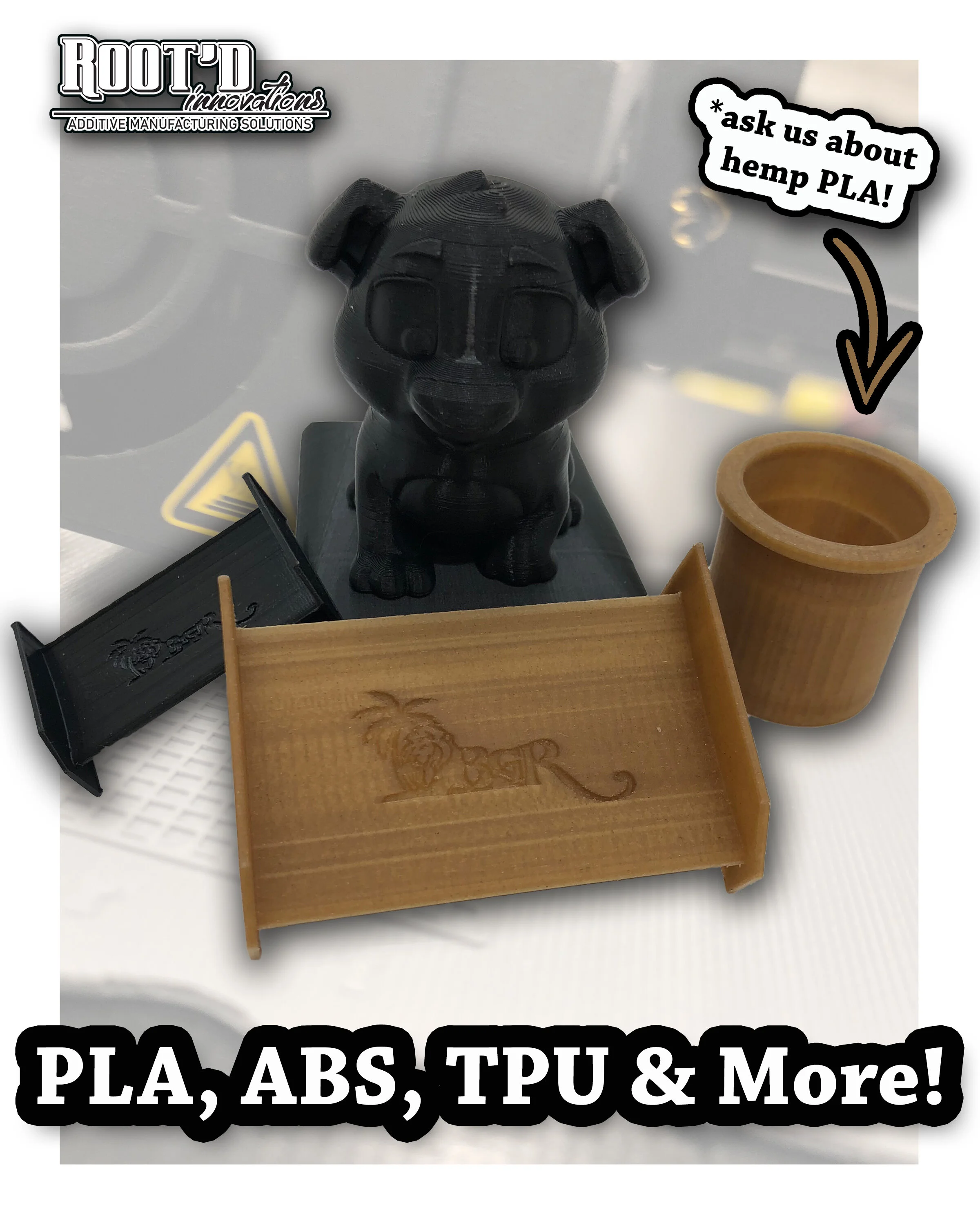 At Root’d Innovations we specialize in Additive Manufacturing (3D printing) for industrial, commercial, and consumer use. We also offer 3D design to ease the transition from concept to end use product.